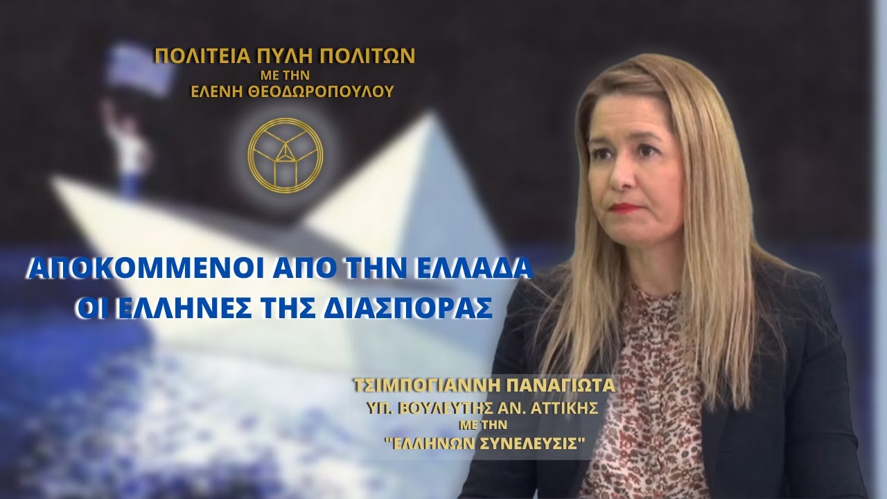 Στην εκπομπή «ΠΟΛΙΤΕΙΑ ΠΥΛΗ ΠΟΛΙΤΩΝ» με την ΕΛΕΝΗ ΘΕΟΔΩΡΟΠΟΥΛΟΥ, η κυρία ΤΣΙΜΠΟΓΙΑΝΝΗ ΠΑΝΑΓΙΩΤΑ , Διευθύντρια Γραφείου του Πολιτικού Φορέα «ΕΛΛΗΝΩΝ ΣΥΝΕΛΕΥΣΙΣ» επισημαίνει ως μοναδική αιτία για την Ελληνική μετανάστευση τις διαχρονικές κυβερνητικές και κομματικές πολιτικές οι οποίες στέρησαν το έμψυχο παραγωγικό δυναμικό της χώρας μας αλλά και απέκοψαν τους Έλληνες της διασποράς από το μητροπολιτικό κέντρο.